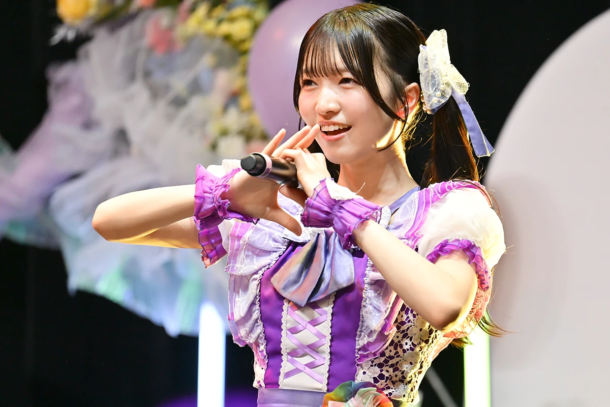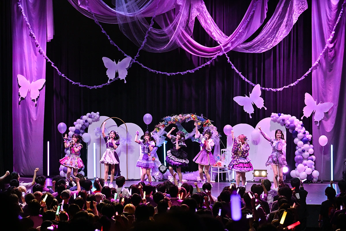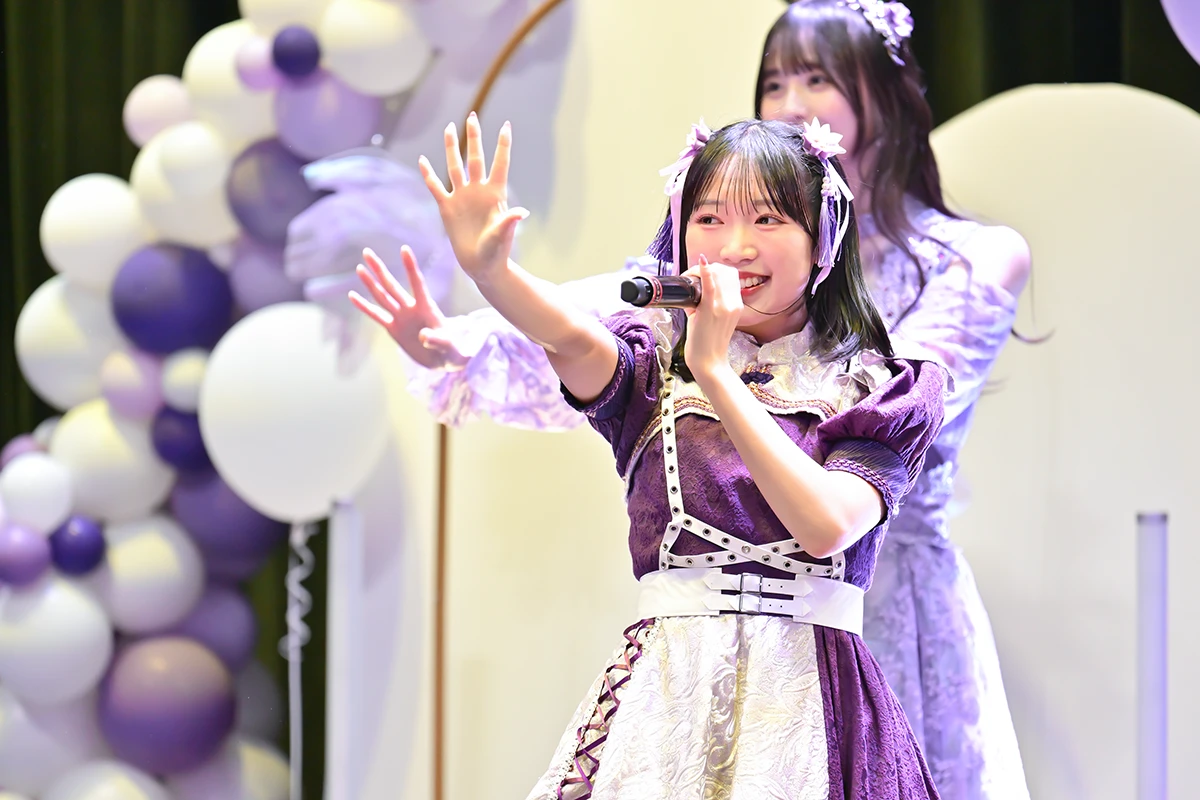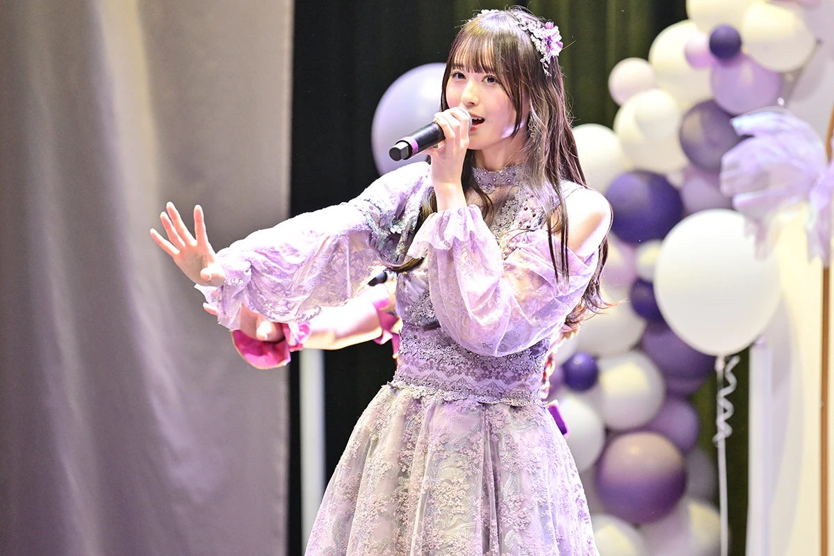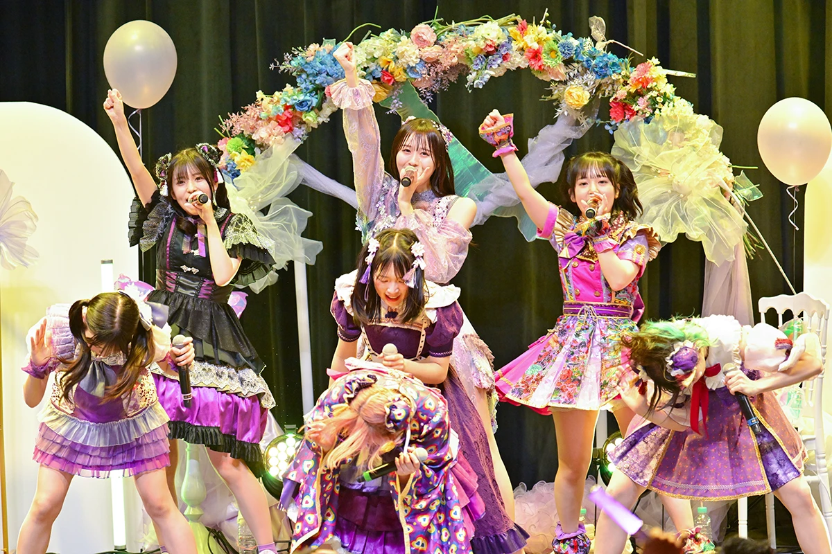 ステージも紫色を中心にデコレーションされているが、アーチの部分に用いた7色のメンバーカラーによるフラワーアレンジは、工藤のか本人のリクエストだったそうだ。記念撮影タイムを挟んで次のブロックへ……。