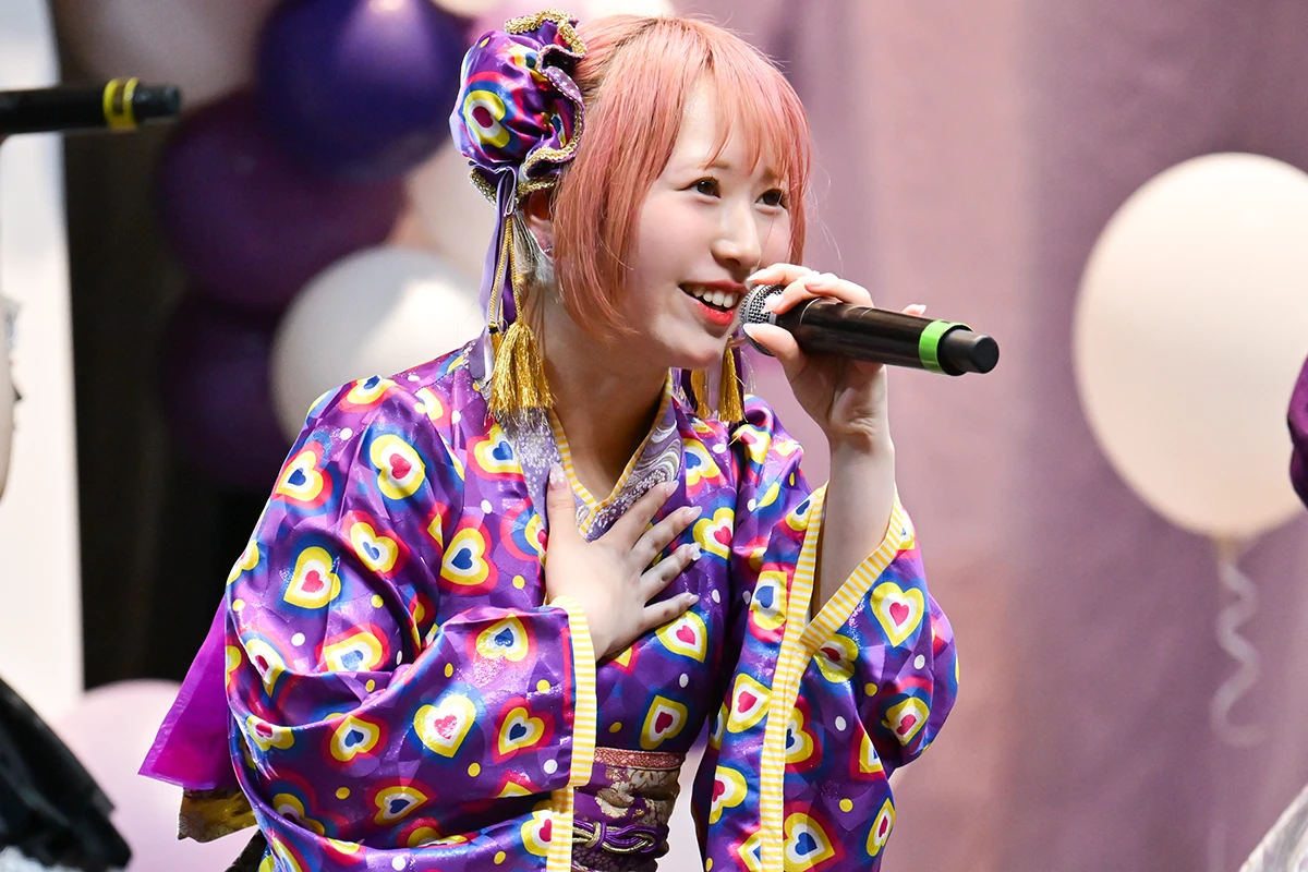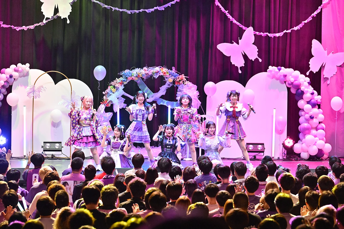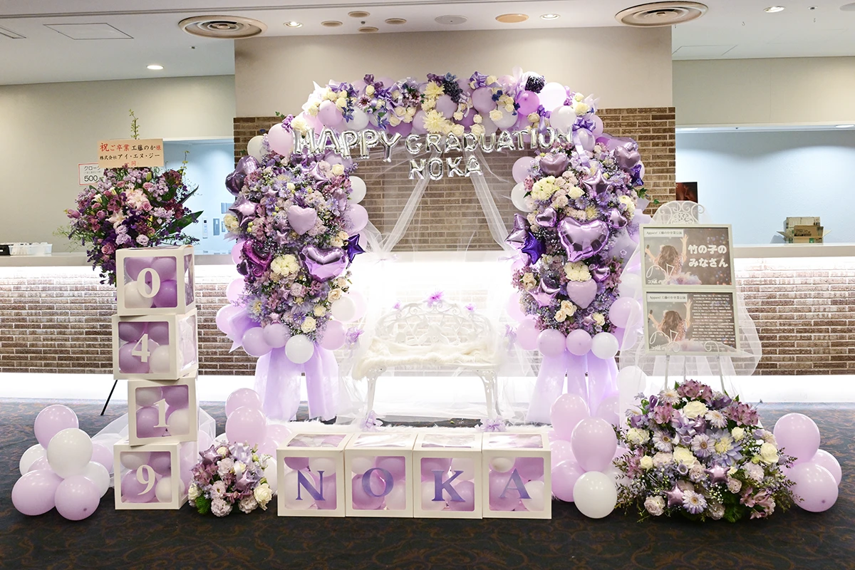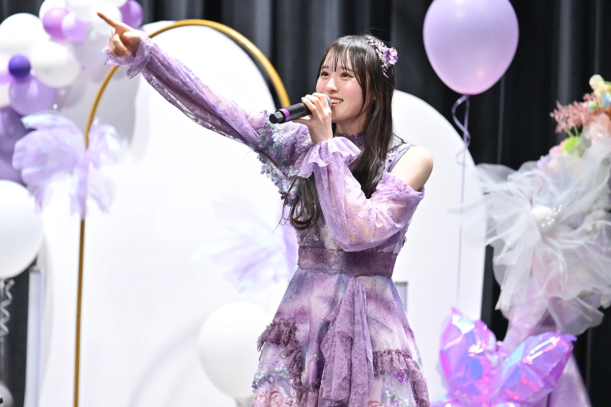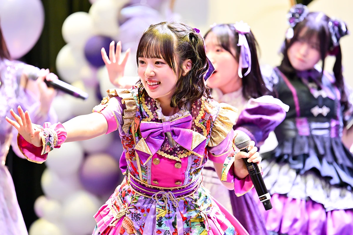 ステージも紫色を中心にデコレーションされているが、アーチの部分に用いた7色のメンバーカラーによるフラワーアレンジは、工藤のか本人のリクエストだったそうだ。記念撮影タイムを挟んで次のブロックへ……。