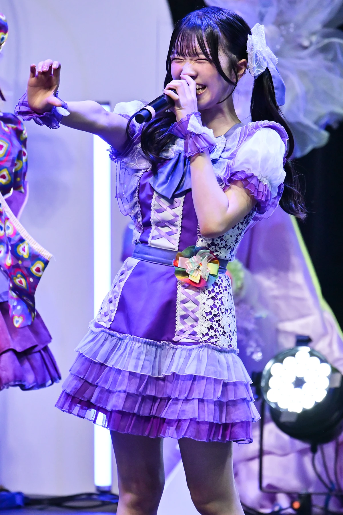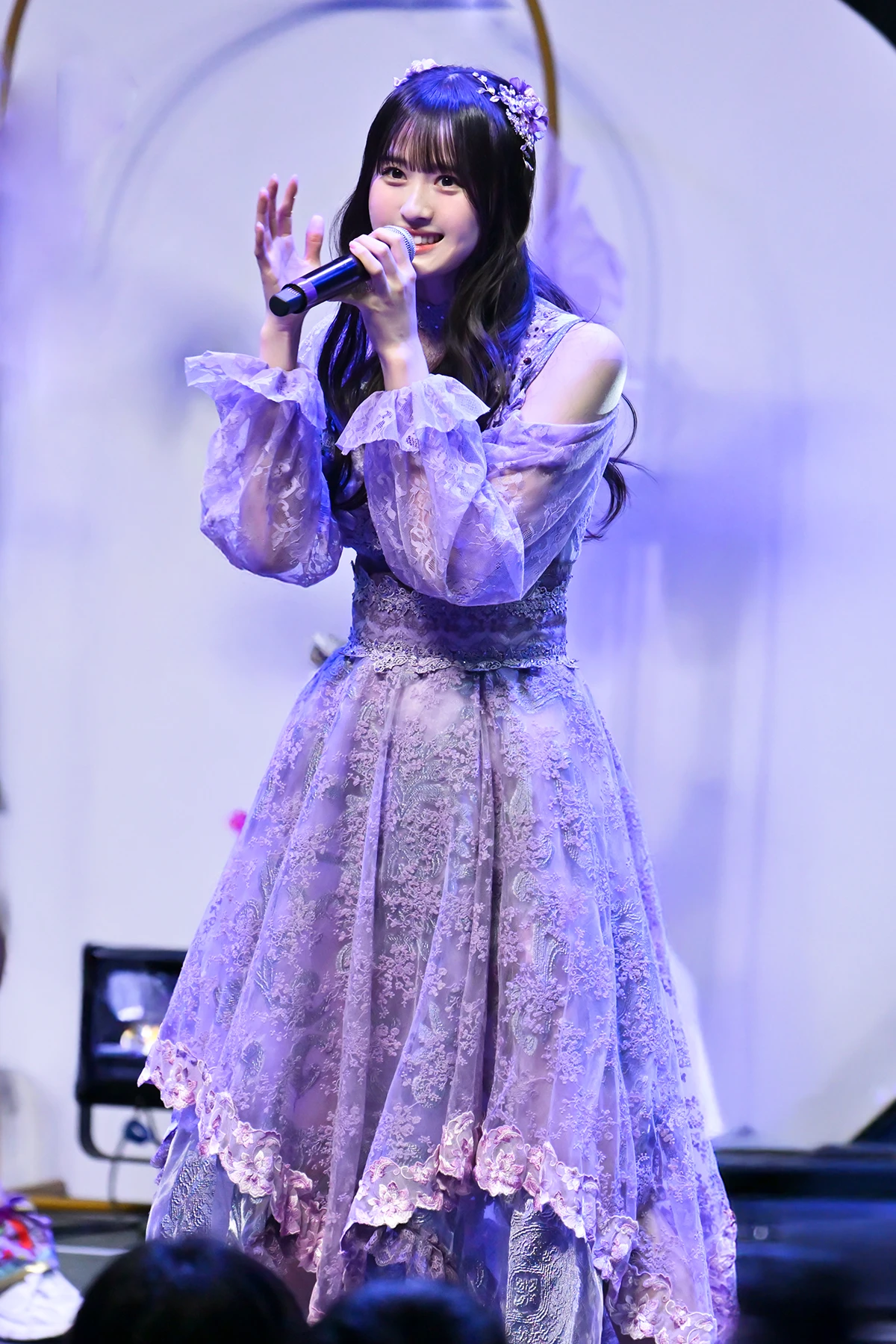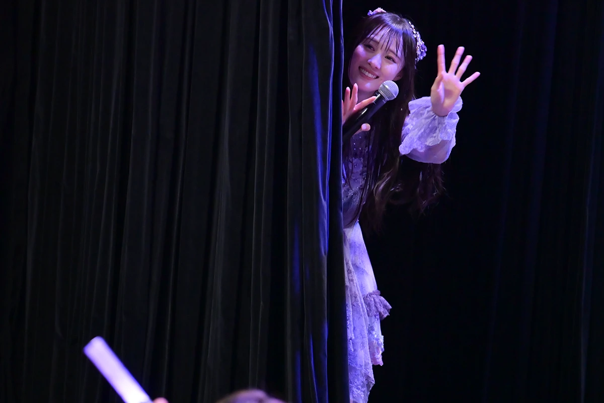 ここでMCタイムとなり、センターに工藤のかを据えた、いつもと違うフォーメーションで自己紹介。工藤のかだけはロングバージョンの自己紹介をするが、本人もそのフレーズを「なんだっけ?」というほど、ひさびさに披露。今日のために作ってもらった衣装は、「着てみたかったんです」というロングドレスで、淡いトーンの紫をベースにレースやフリルをふんだんに用いた。裾はレイヤードのスカートをあしらったプリンセス感あふれるもの。長身モデル体型の彼女が着ると、ひときわ目をひく。
