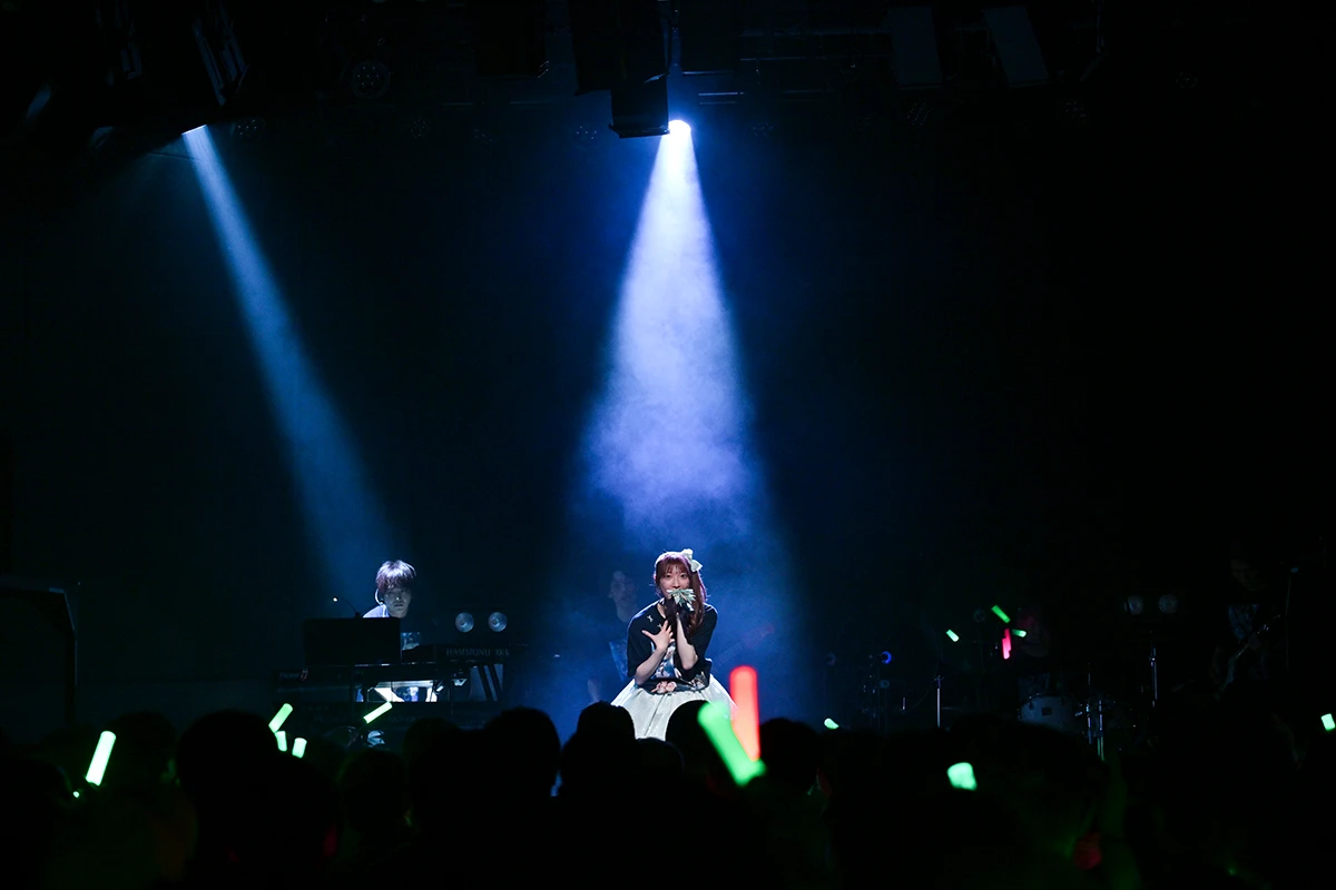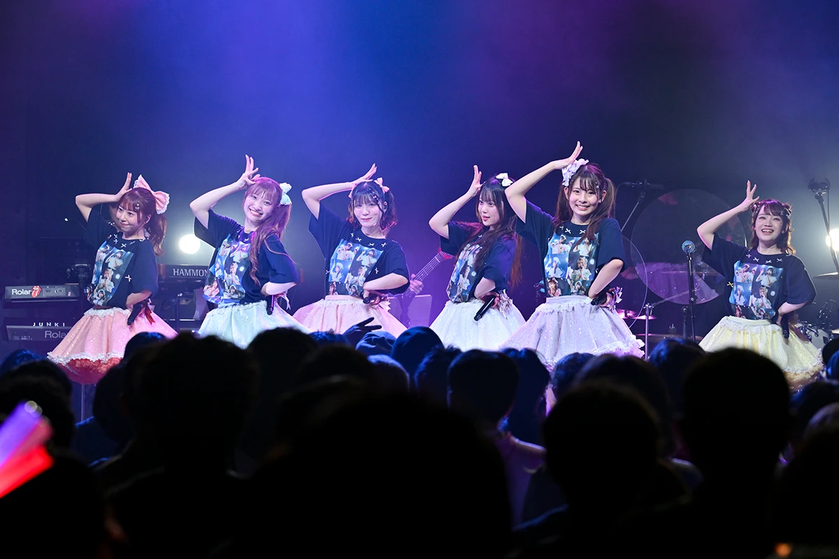 ここで本編は終了となるが、記念すべきファーストワンマンだけに、アンコールが鳴り止まない。再びバンドが登場すると、ピアノ演奏から、Sチケット特典のオリジナルTシャツを着た6人が再登場。
