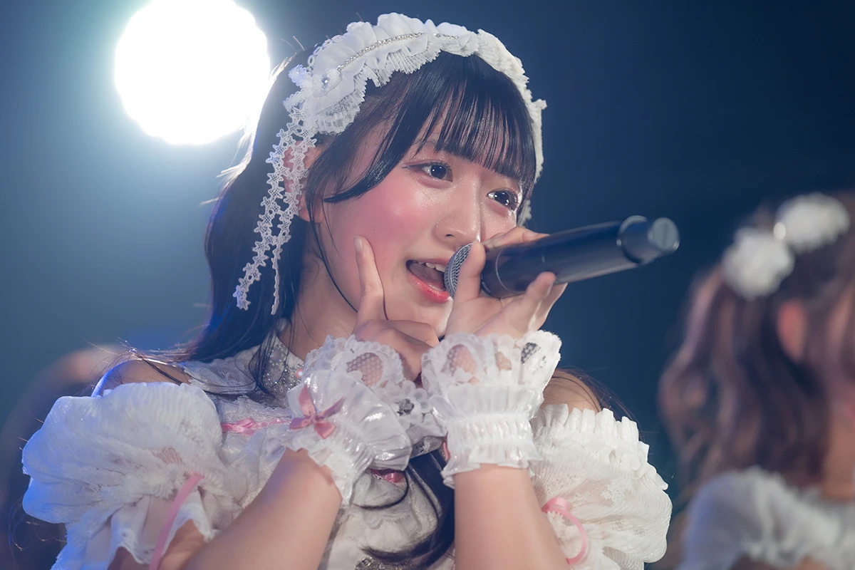 最初のMCパートに入ると、本日が初お披露目となる新メンバー・三塚花梨が「今日から新メンバーになった花梨を、覚えてもらって帰ってほしいです。すでに緊張していますがもう楽しいです!」と満面の笑顔を浮かべながら、初々しい挨拶を述べていた。また新衣装に話が及ぶと黒田かほが、『前の衣装はダークっぽい感じだったけど、急にかわいい感じになって良いですよね?』と問いかけると、“可愛い~”という声援で湧いていた。三塚花梨も、スカートを手でヒラヒラさせながら気に入っている素振りを見せていた。