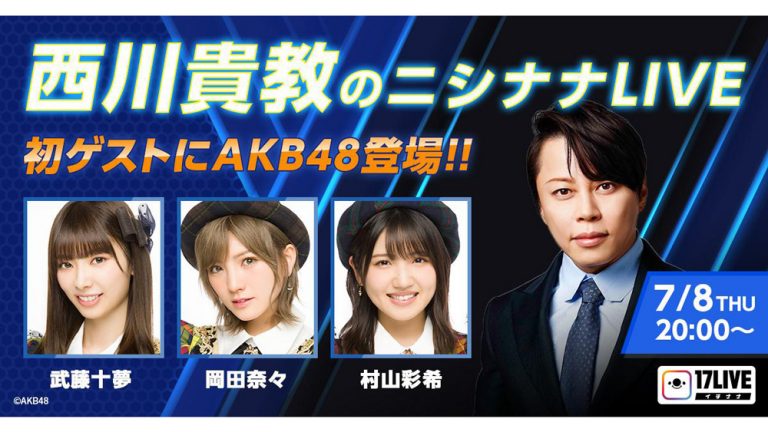 7日8日(木)20時から17LIVEでライブ配信される「西川貴教のニシナナLIVE」に、番組初のゲストとしてAKB48から武藤十夢、岡田奈々、村山彩希の出演が決定!