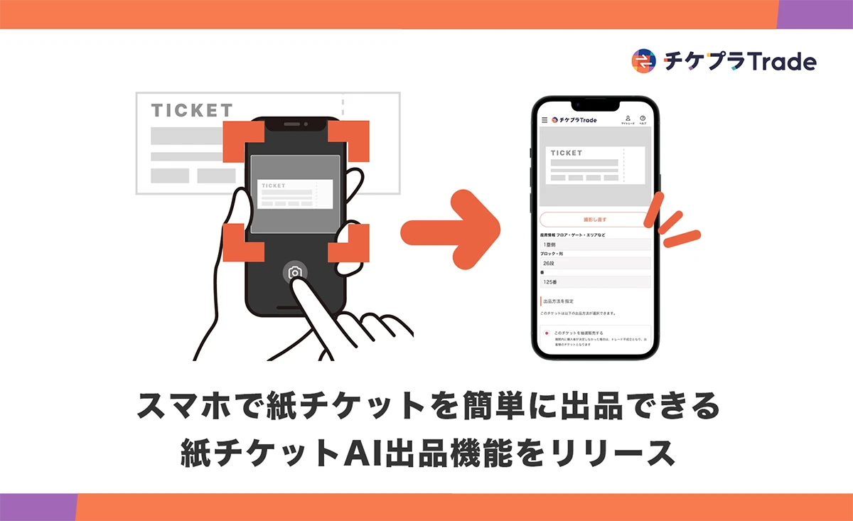 チケプラTradeは年間30万件以上のチケット公式リセールの取引成立実績を有し、紙チケット、電子チケット問わず、アーティストやイベント主催者の公式リセールの基盤となっている。紙チケットのAI出品機能は、紙チケットに記載されている情報をスマホのカメラでスキャンし、スキャンした情報から公式リセールへの出品を可能とするシステムである。