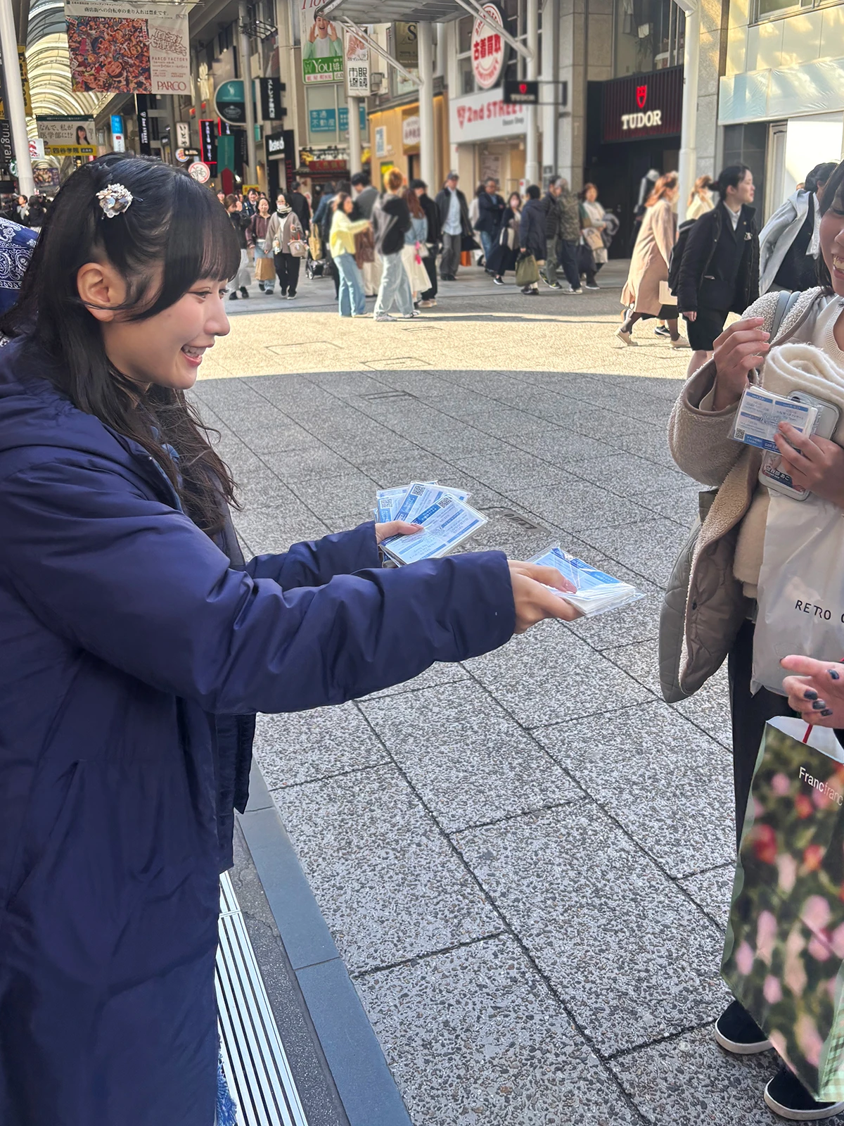 STU48メンバーが、STU48広島劇場(広島CLUB QUATTRO)付近にサプライズ登場し、4月に開催する9周年コンサートのPRを兼ねてティッシュ配りを行った。