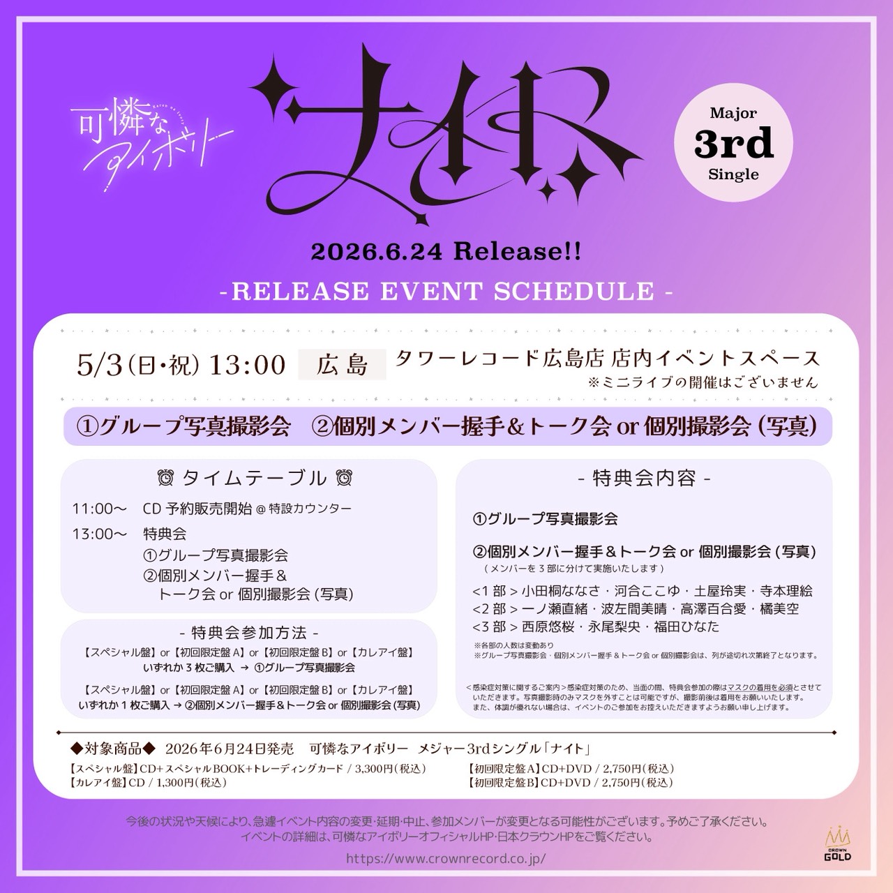 また、全国4都市を巡る全国ツアー「可憐なアイボリー 全国ツアー2026 ナイト」の初日公演が5月2日にBLUE LIVE広島にて開催される。
