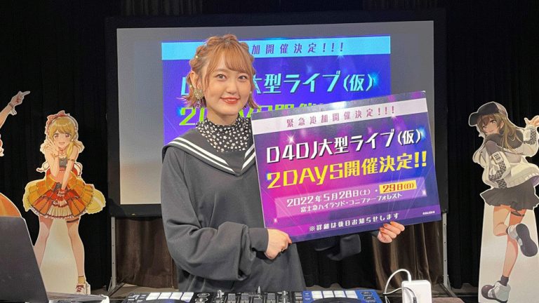 ブシロード発のDJをテーマにしたメディアミックスプロジェクト「D4DJ」。2022年5月28日(土)に、富士急ハイランド・コニファーフォレストにて開催予定の「D4DJ大型ライブ(仮)」について、申込み多数につき5月28日(土)・5月29日(日)の2DAYSで追加開催することを、現在渋谷イープラスにて開催中の「#D4DJ_DJTIME +LOUNGE」のトークイベント内で緊急発表した。