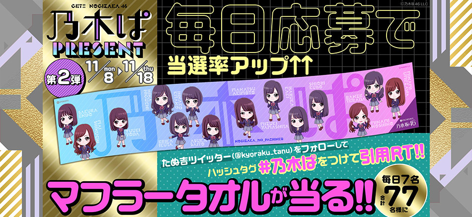 たぬ吉ツイッターをフォローして、ハッシュタグ「#乃木ぱ」をつけて引用リツイートすると、毎日7名様(合計77名)に抽選で当たる!