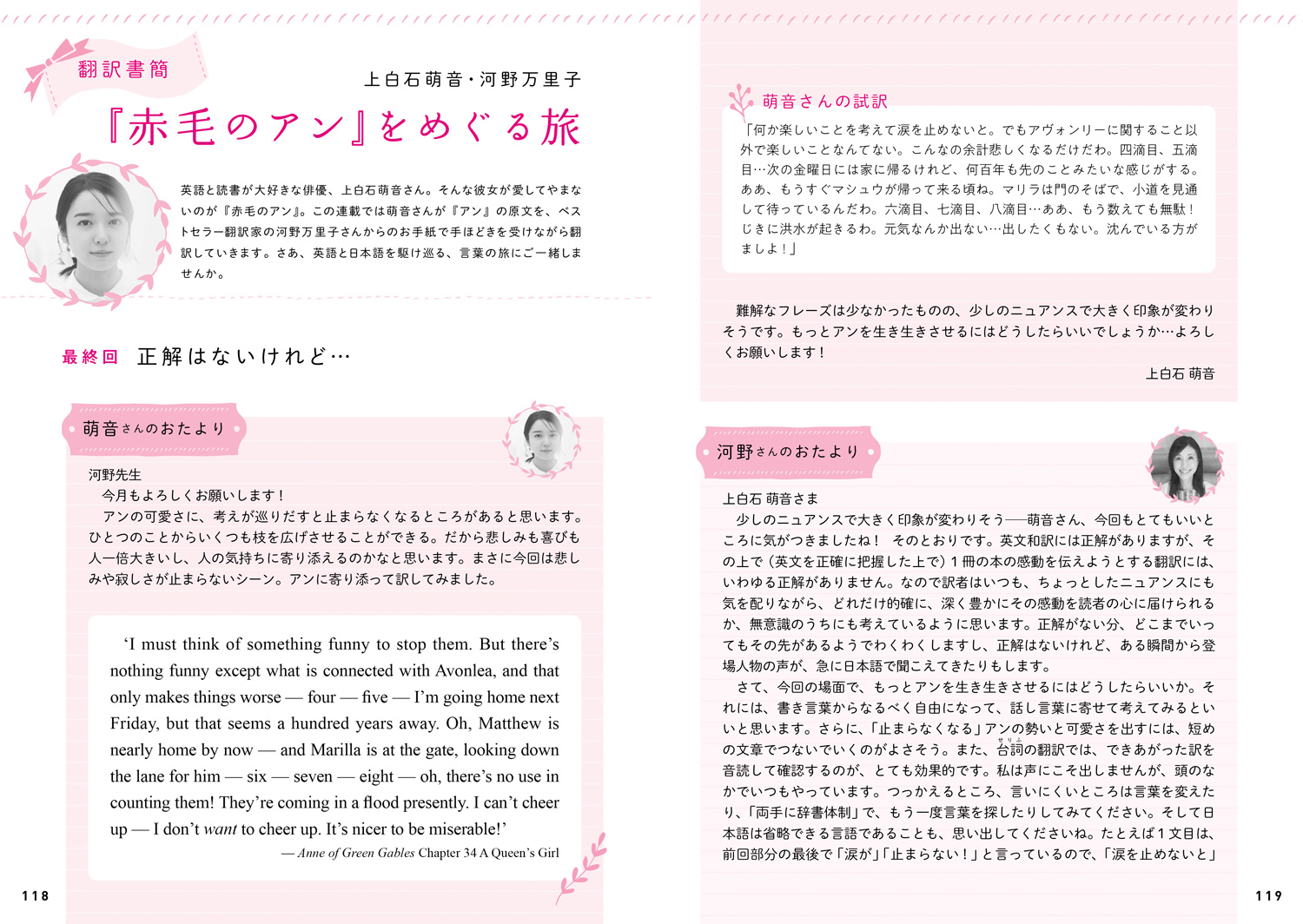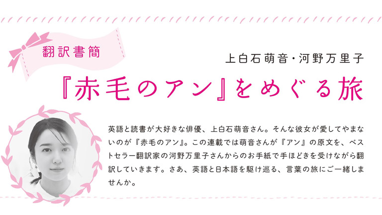 そんな彼女は2020~21年度「ラジオ英会話」テキストの連載にて、世界文学の名作『赤毛のアン』の名場面を、ベストセラー翻訳家の河野万里子さんの指導を受けながら翻訳を続けてきた。 往復書簡の形で、上白石萌音が訳した日本語を河野さんが添削し、それを受けて上白石萌音が再度訳す…その過程で上白石萌音のことばが磨かれていくのが本連載の読みどころとなっている。