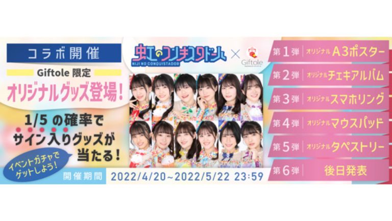 オンラインクレーンサービス「TSUTAYA オンラインゲーム Giftole(ギフトーレ)」にて、アイドルグループ・虹のコンキスタドールとのオリジナルコラボグッズが登場する。