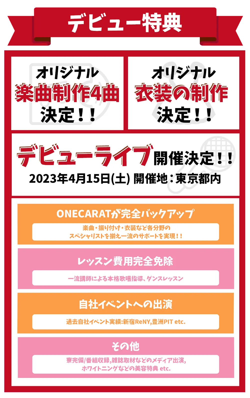 さらに、このオーディションに合格したアイドルグループは、2023年4月15日(土)にデビューライブを開催。今回の発表から今後約8ヶ月というスピードで、デビューという目標に向かって一気に駆け抜けていく予定となっている。