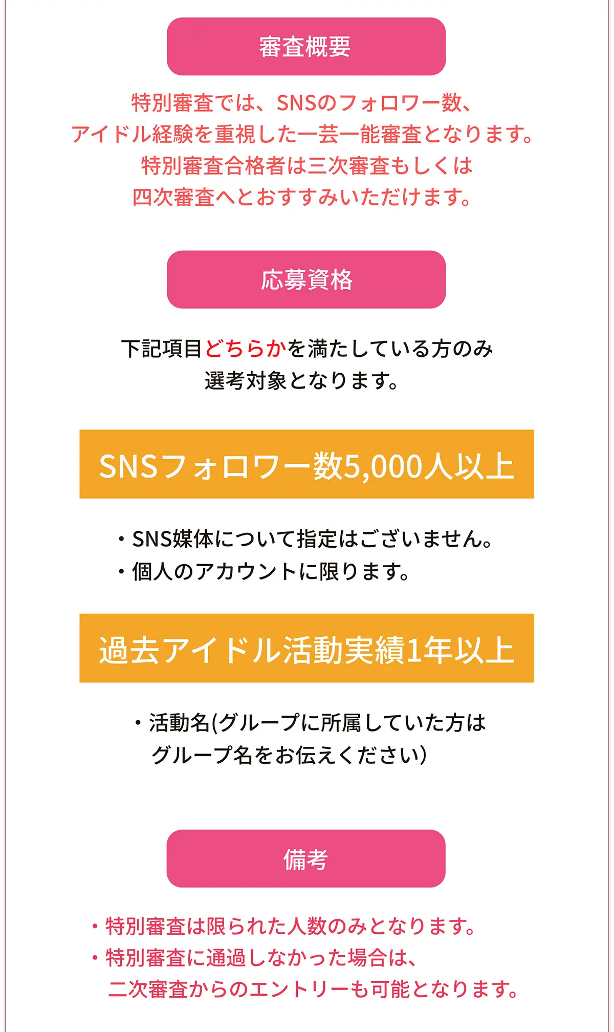 これは、過去にアイドルを1年以上経験し、既に一定のSNSフォロワー数を抱えている人気・実力が認められた応募者用の審査枠。一度はアイドルとして活動した方も、もう一度夢を追いかけられるよう、多くの実力のある方に参加してほしいとの思いから、このような審査枠が設けられた。