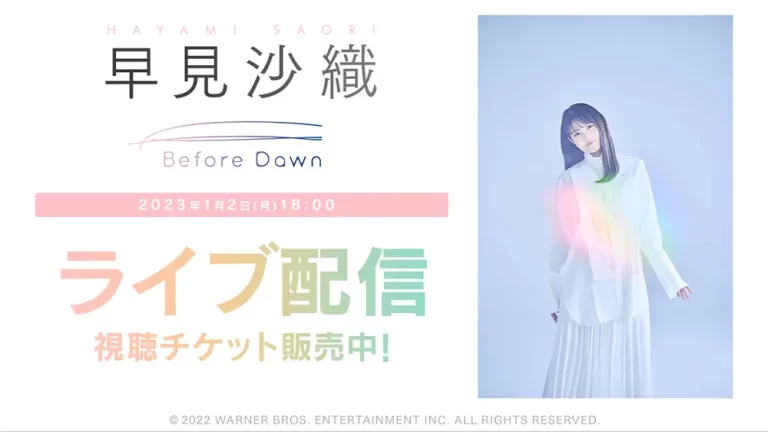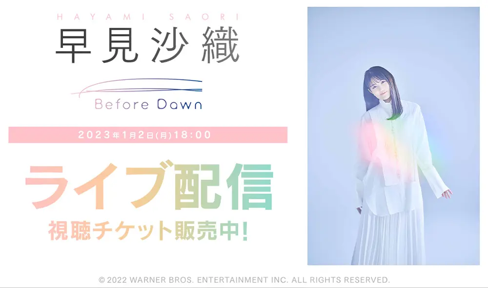 2023年1月2日(月)開催の、声優・早見沙織のスペシャルライブ「Hayami Saori Special Live 2023 Before Dawn-夜明けに君と」が、DMM TVにて独占ライブ配信されることが決定し、配信視聴チケットの販売が開始された。