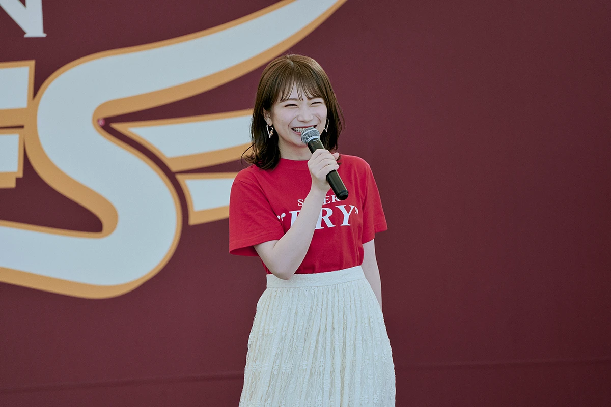 始球式セレモニー前には、球場のイベントステージに出演し、アサヒスーパードライでファンの方々と乾杯。その後のラジオ出演ではどんな時にスーパードライを飲みたいかと聞かれた秋元真夏は「仕事が終わって帰宅した後、お風呂上がりに飲むスーパードライが最高」とビールを嗜む一面を披露。