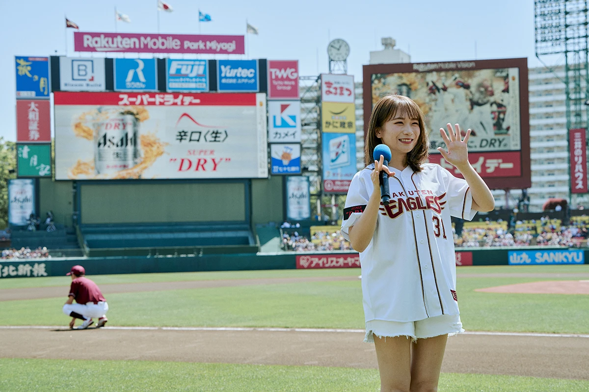 秋元真夏が、東北楽天ゴールデンイーグルス対千葉ロッテ戦の「アサヒスーパードライデー」の始球式に登場。