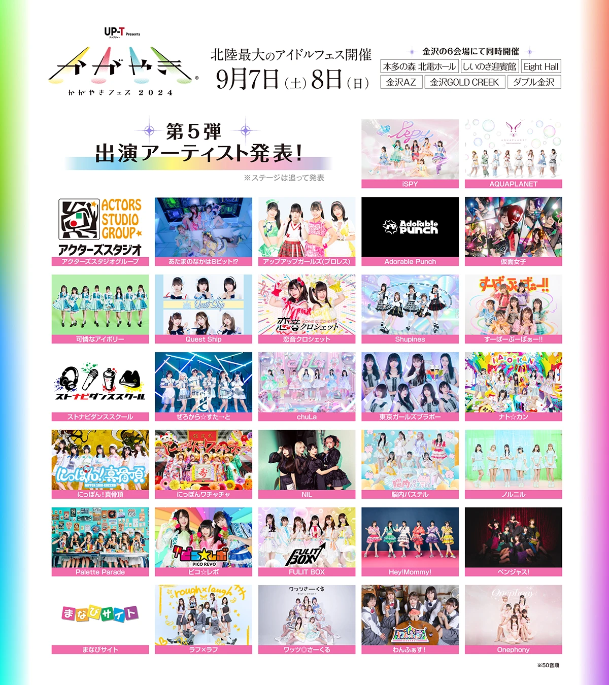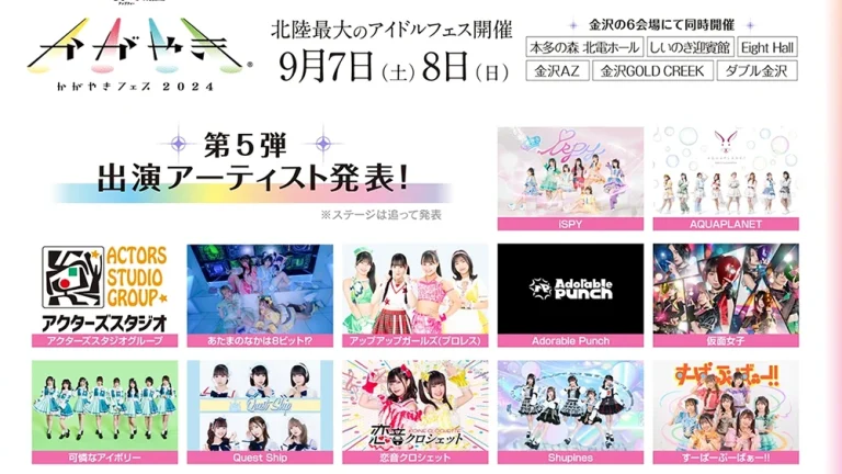 北陸最大のアイドルフェス「UP-T presents かがやきフェス2024」 第5弾出演アーティストとして32組のグループ追加と、発表済みアーティストの出演日程を発表、さらに各会場の入場チケットが販売開始した。
